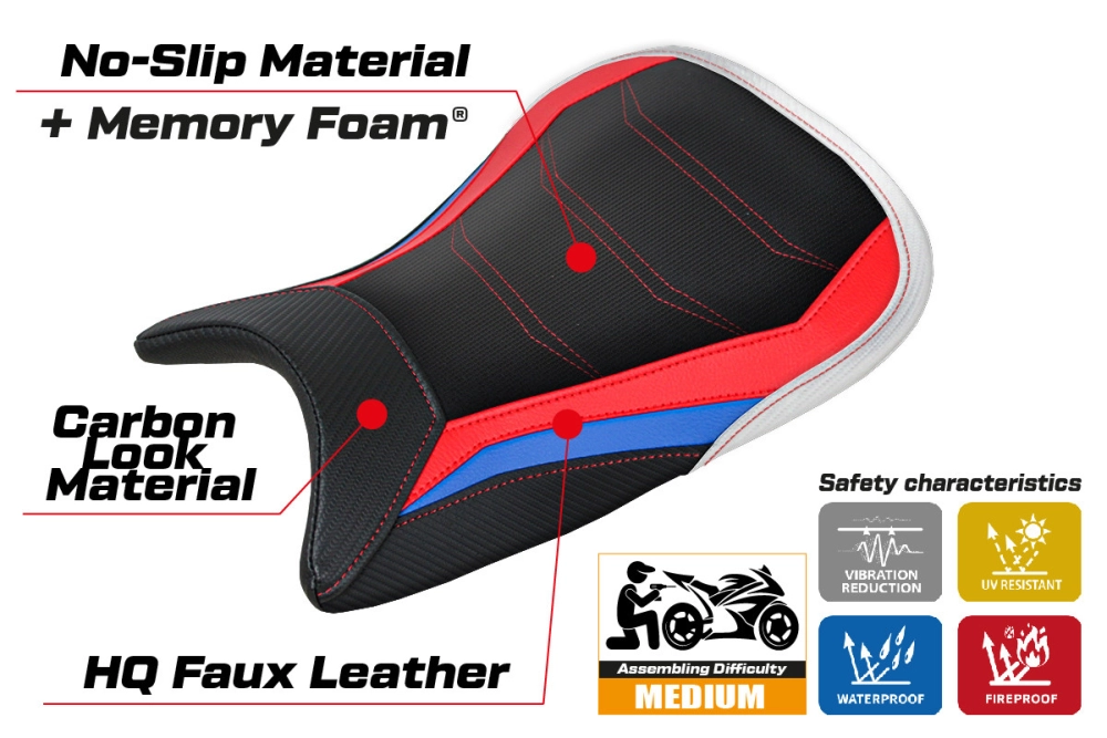 - Confortsystem : Ce revêtement est à l'extérieur exactement identique à tous les autres couvercles, mais est couplé à l'intérieur avec une couche spéciale de 2,5 cm de mousse à mémoire de forme. Tappezzeria Italia est le seul fabricant a utilisé la technologie de la Memory Foam qui permet d'améliorer le confortde conduite en réduisant la fatigue et les vibrations de la moto.