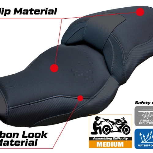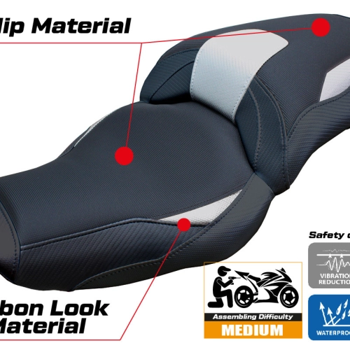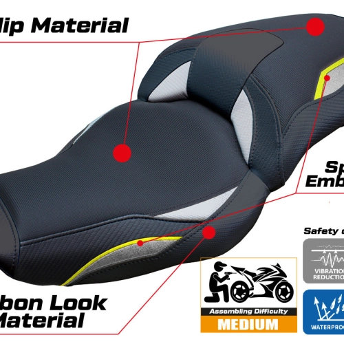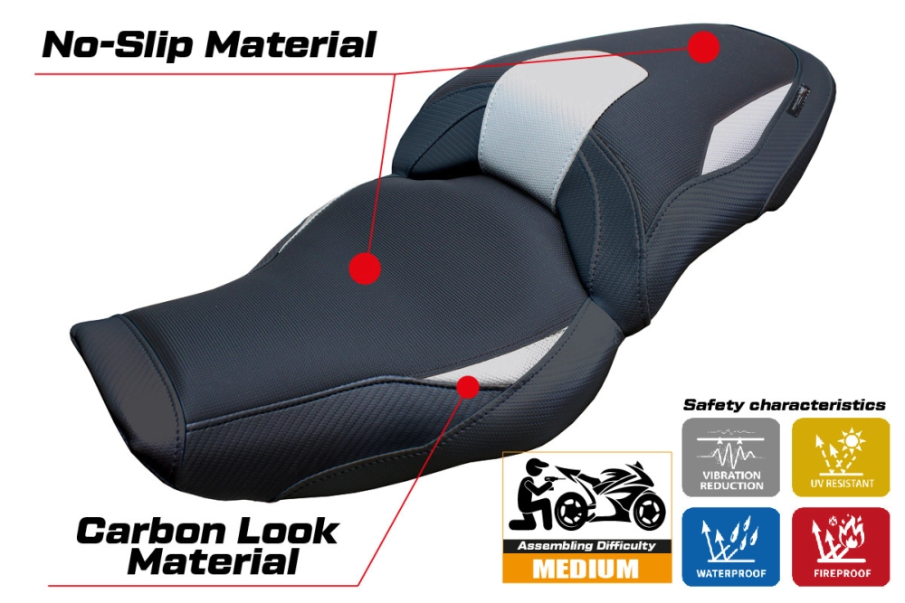 - Ultragrip : Ce type de revêtement est particulièrement adapté aux motos sportives où une plus grande adhérence sur la selle est requise. Le matériau, extrêmement poreux, est surnommé « asphalte » en raison de sa rugosité similaire à celle de la chaussée.