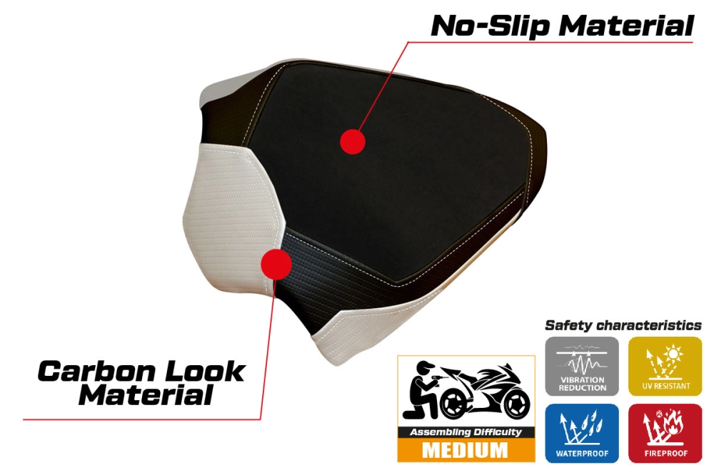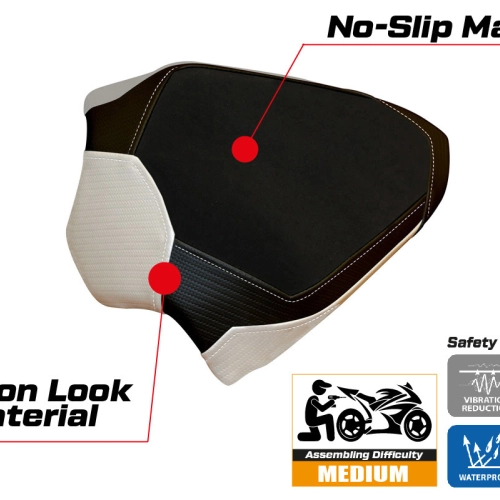 Le Couvre selle passager pour Ducati Panigale V4 (18-24) modèle Cancun 2 vous permet de changer facilement l'esthétique de votre siège de moto d'origine. Il possèdes des caractéristiques techniques essentielles pour une housse de siège moto de qualité : imperméable et résistant au soleil, coutures renforcées à double piqûre et une haute résistance aux produits chimiques.