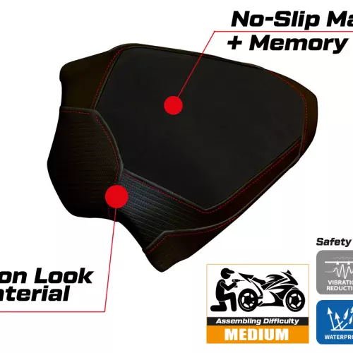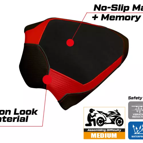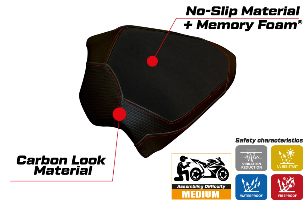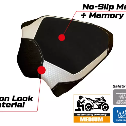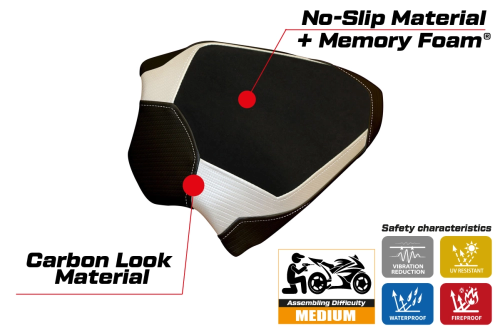 Le Couvre selle passager pour Ducati Panigale V4 (18-24) modèle Rivoli 1 comfort system vous permet de changer facilement l'esthétique de votre siège de moto d'origine. Il possèdes des caractéristiques techniques essentielles pour une housse de siège moto de qualité : imperméable et résistant au soleil, coutures renforcées à double piqûre et une haute résistance aux produits chimiques.