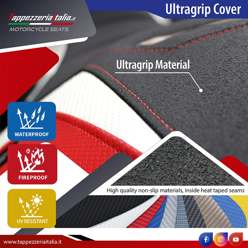 - Ultragrip : Ce type de revêtement est particulièrement adapté aux motos sportives où une plus grande adhérence sur la selle est requise. Le matériau, extrêmement poreux, est surnommé « asphalte » en raison de sa rugosité similaire à celle de la chaussée.