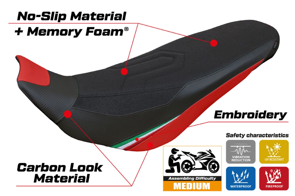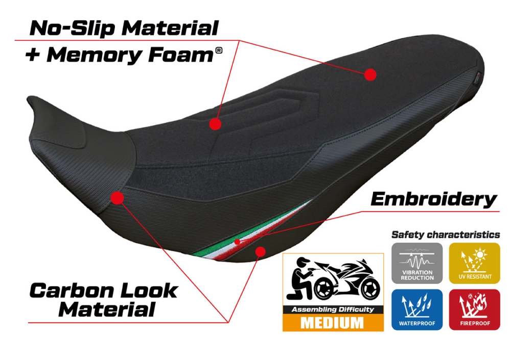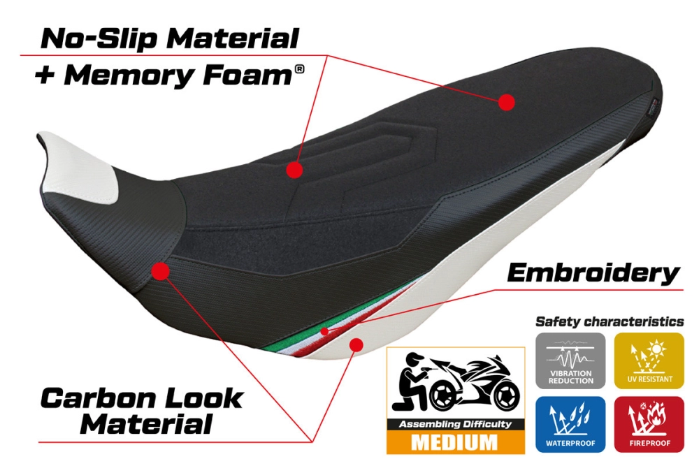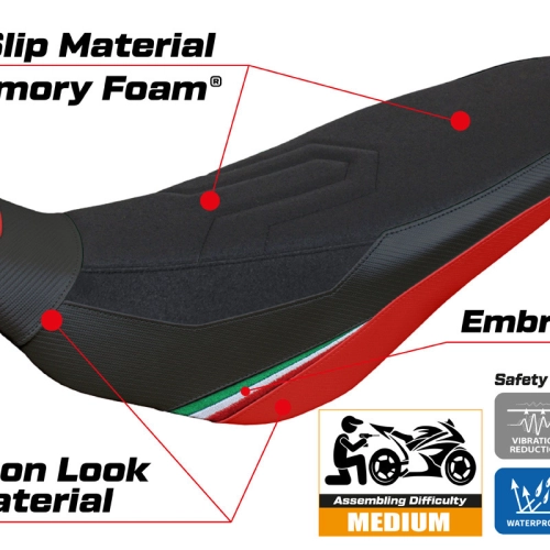 - Confortsystem : Ce revêtement est à l'extérieur exactement identique à tous les autres couvercles, mais est couplé à l'intérieur avec une couche spéciale de 2,5 cm de mousse à mémoire de forme. Tappezzeria Italia est le seul fabricant a utilisé la technologie de la Memory Foam qui permet d'améliorer le confortde conduite en réduisant la fatigue et les vibrations de la moto.