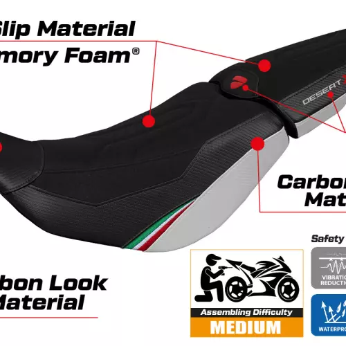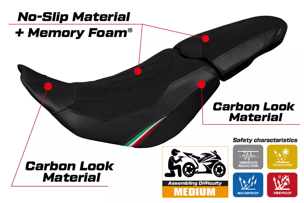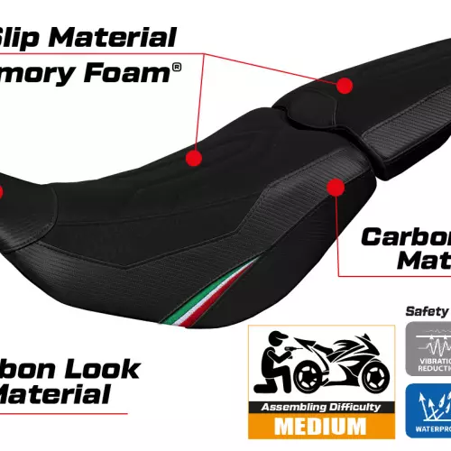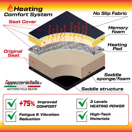 - Confortsystem : Ce revêtement est à l'extérieur exactement identique à tous les autres couvercles, mais est couplé à l'intérieur avec une couche spéciale de 2,5 cm de mousse à mémoire de forme. Tappezzeria Italia est le seul fabricant a utilisé la technologie de la Memory Foam qui permet d'améliorer le confortde conduite en réduisant la fatigue et les vibrations de la moto.