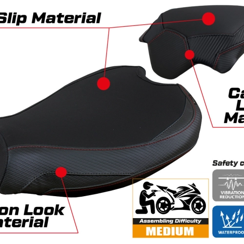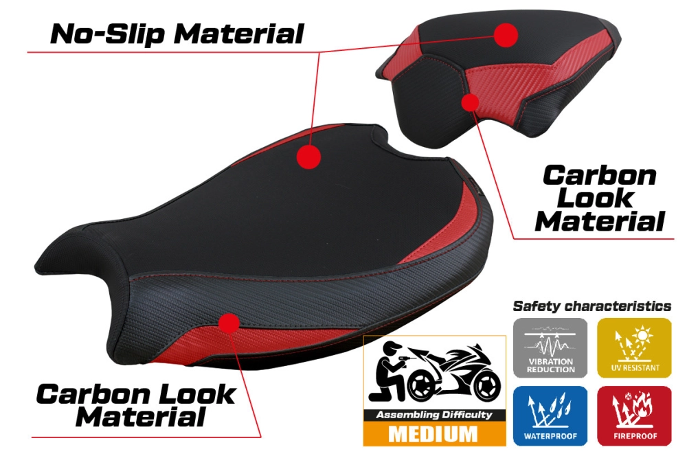 - Confortsystem : Ce revêtement est à l'extérieur exactement identique à tous les autres couvercles, mais est couplé à l'intérieur avec une couche spéciale de 2,5 cm de mousse à mémoire de forme. Tappezzeria Italia est le seul fabricant a utilisé la technologie de la Memory Foam qui permet d'améliorer le confortde conduite en réduisant la fatigue et les vibrations de la moto.