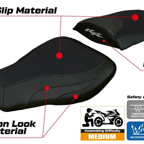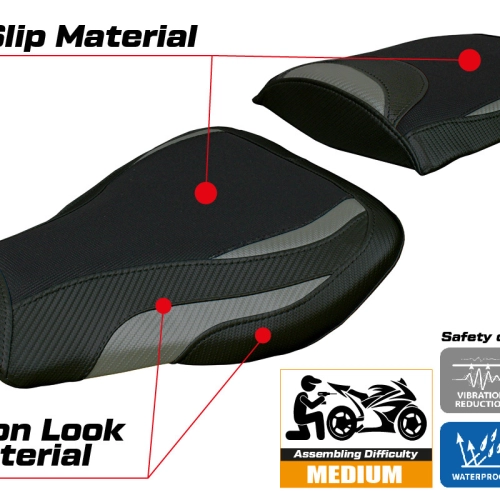 - Ultragrip : Ce type de revêtement est particulièrement adapté aux motos sportives où une plus grande adhérence sur la selle est requise. Le matériau, extrêmement poreux, est surnommé « asphalte » en raison de sa rugosité similaire à celle de la chaussée.