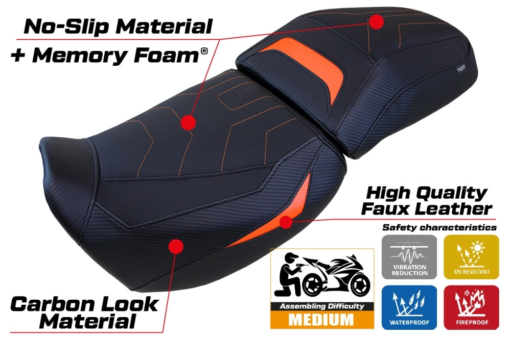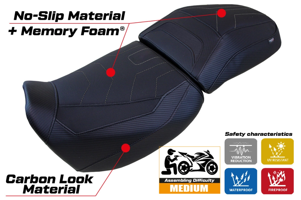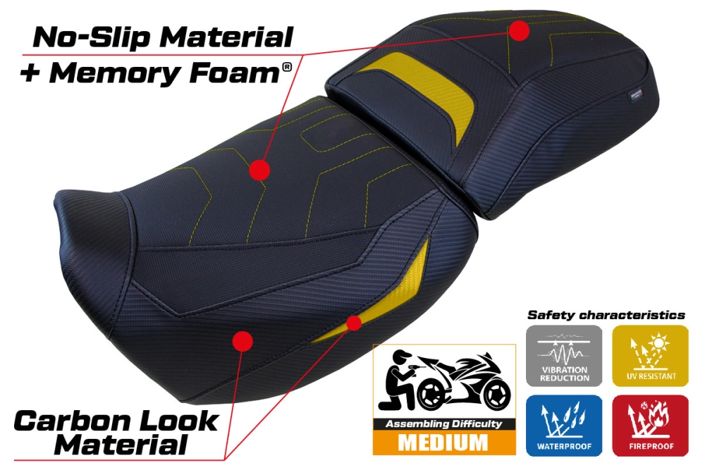 - Confortsystem : Ce revêtement est à l'extérieur exactement identique à tous les autres couvercles, mais est couplé à l'intérieur avec une couche spéciale de 2,5 cm de mousse à mémoire de forme. Tappezzeria Italia est le seul fabricant a utilisé la technologie de la Memory Foam qui permet d'améliorer le confortde conduite en réduisant la fatigue et les vibrations de la moto.