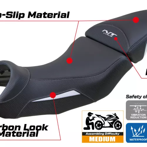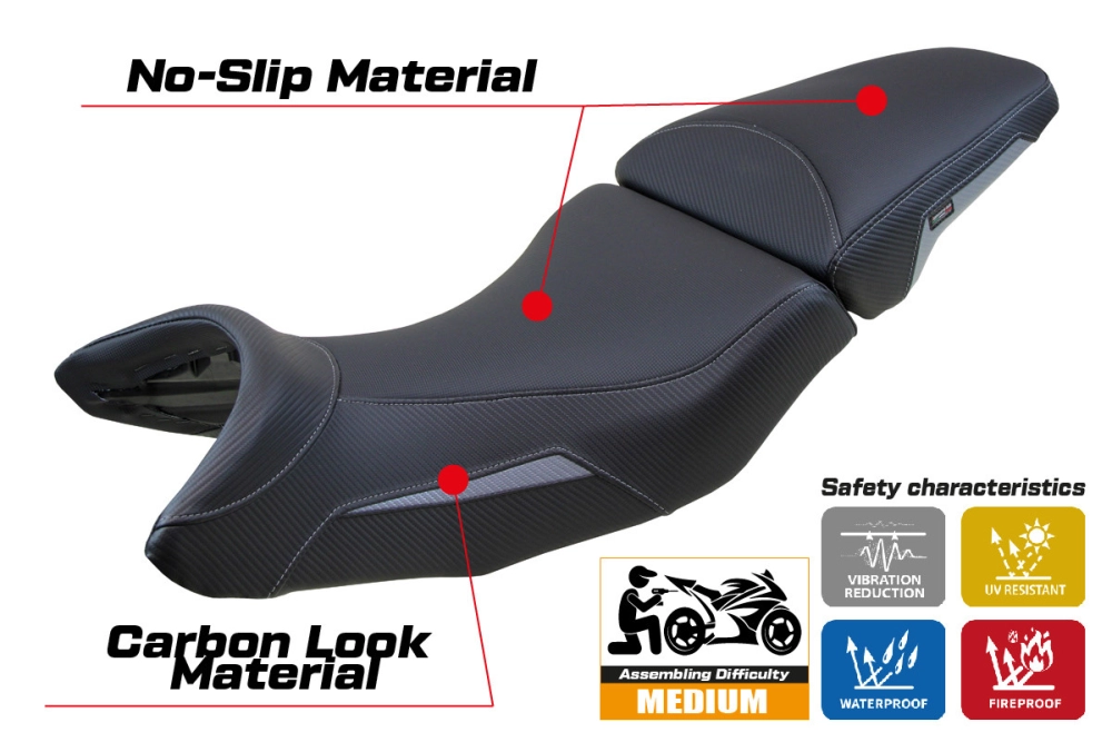 - Confortsystem : Ce revêtement est à l'extérieur exactement identique à tous les autres couvercles, mais est couplé à l'intérieur avec une couche spéciale de 2,5 cm de mousse à mémoire de forme. Tappezzeria Italia est le seul fabricant a utilisé la technologie de la Memory Foam qui permet d'améliorer le confortde conduite en réduisant la fatigue et les vibrations de la moto.