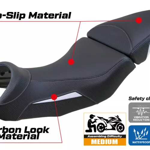 - Ultragrip : Ce type de revêtement est particulièrement adapté aux motos sportives où une plus grande adhérence sur la selle est requise. Le matériau, extrêmement poreux, est surnommé « asphalte » en raison de sa rugosité similaire à celle de la chaussée.
