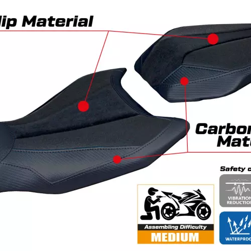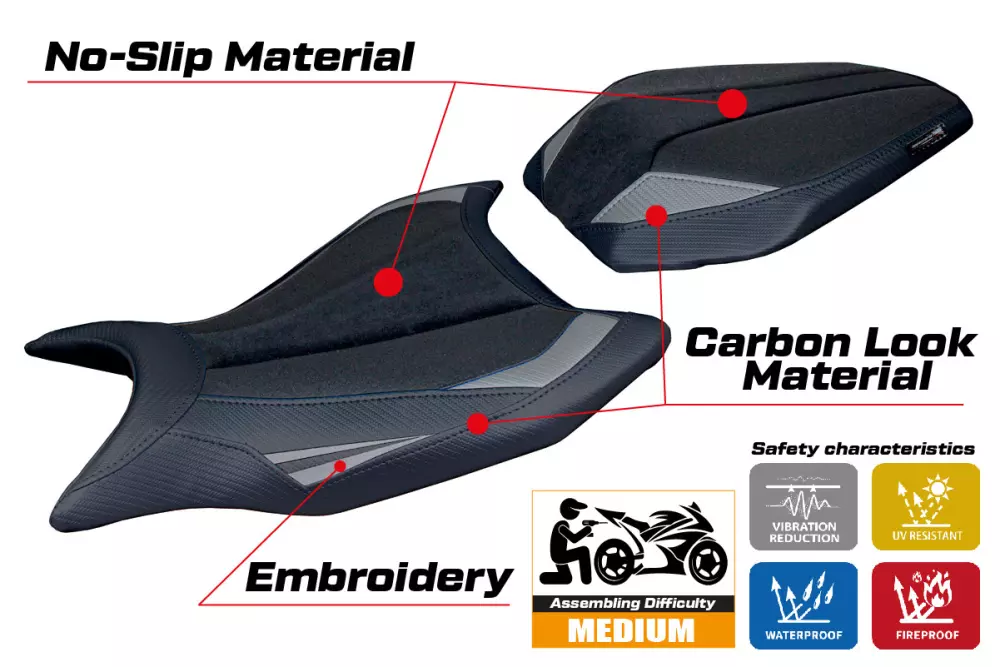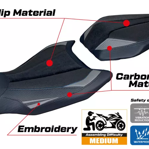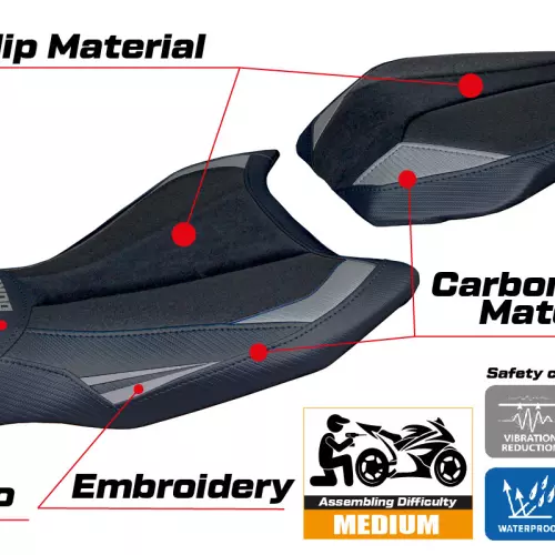- Ultragrip : Ce type de revêtement est particulièrement adapté aux motos sportives où une plus grande adhérence sur la selle est requise. Le matériau, extrêmement poreux, est surnommé « asphalte » en raison de sa rugosité similaire à celle de la chaussée.