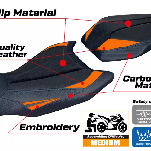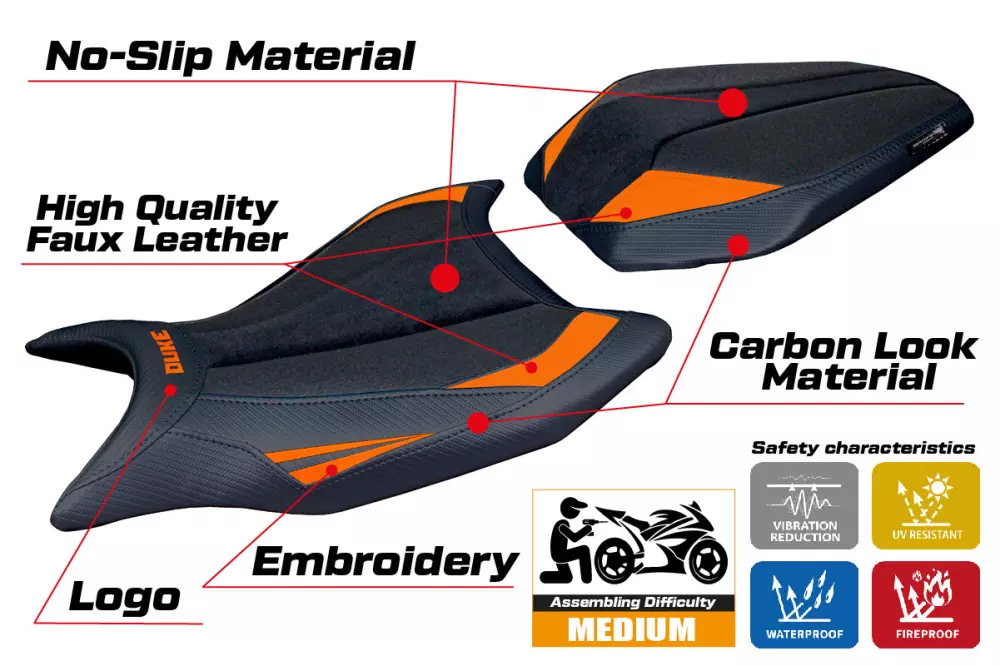 Le Couvre selle Tappezzeria KTM 990 Duke (de 2024) modèle Cannes ultragrip vous permet de changer facilement l'esthétique de votre siège de moto d'origine. Il possèdes des caractéristiques techniques essentielles pour une housse de siège moto de qualité : imperméable et résistant au soleil, coutures renforcées à double piqûre et une haute résistance aux produits chimiques.