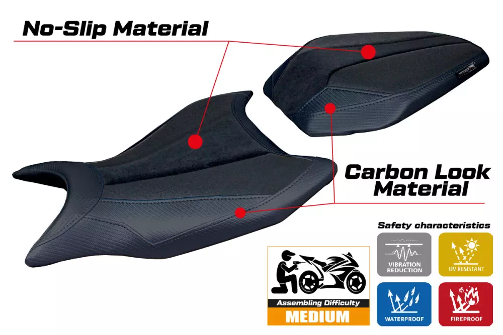 - Confortsystem : Ce revêtement est à l'extérieur exactement identique à tous les autres couvercles, mais est couplé à l'intérieur avec une couche spéciale de 2,5 cm de mousse à mémoire de forme. Tappezzeria Italia est le seul fabricant a utilisé la technologie de la Memory Foam qui permet d'améliorer le confortde conduite en réduisant la fatigue et les vibrations de la moto.