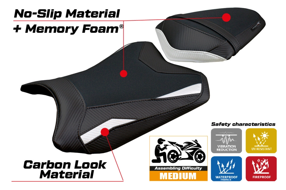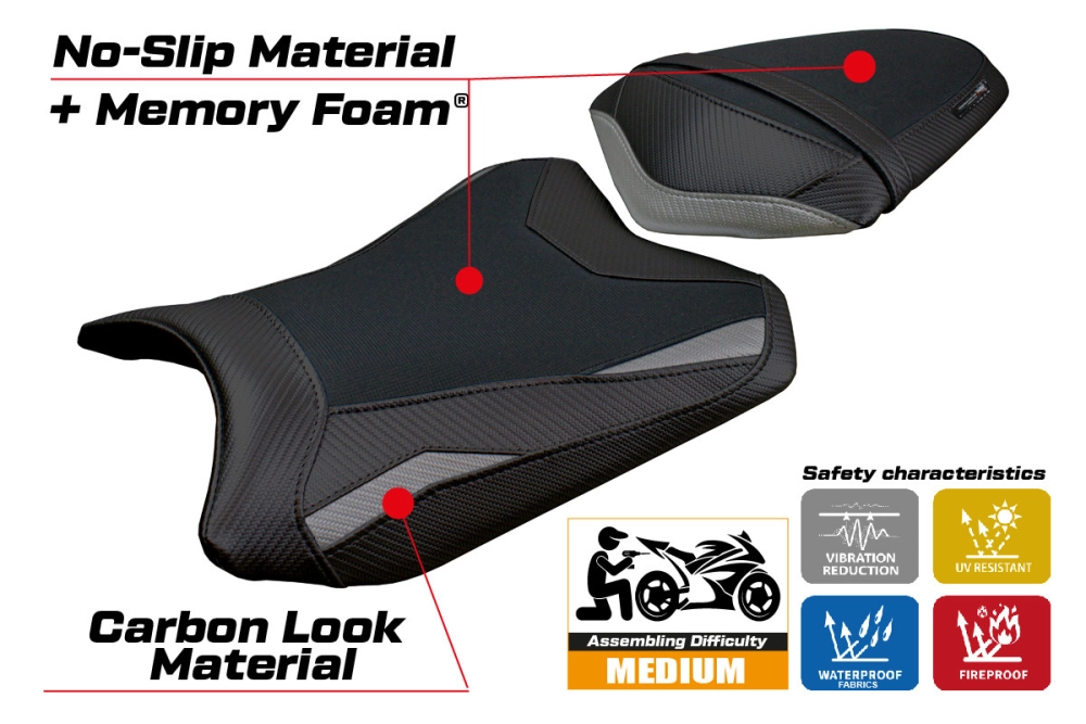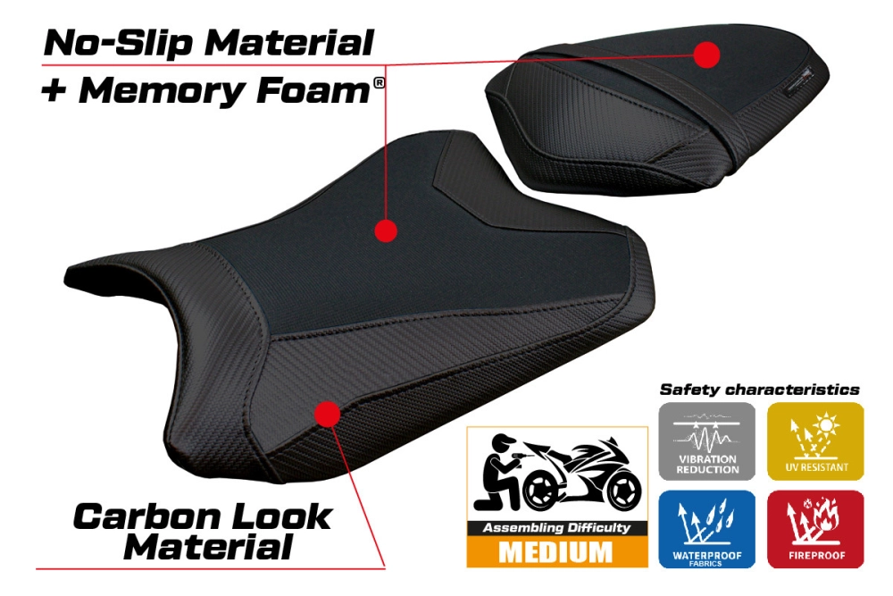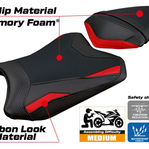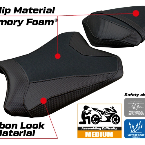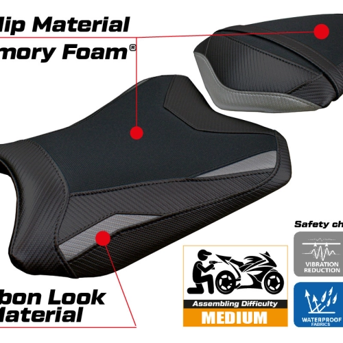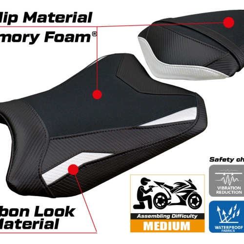 - Confortsystem : Ce revêtement est à l'extérieur exactement identique à tous les autres couvercles, mais est couplé à l'intérieur avec une couche spéciale de 2,5 cm de mousse à mémoire de forme. Tappezzeria Italia est le seul fabricant a utilisé la technologie de la Memory Foam qui permet d'améliorer le confortde conduite en réduisant la fatigue et les vibrations de la moto.
