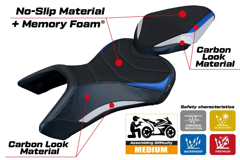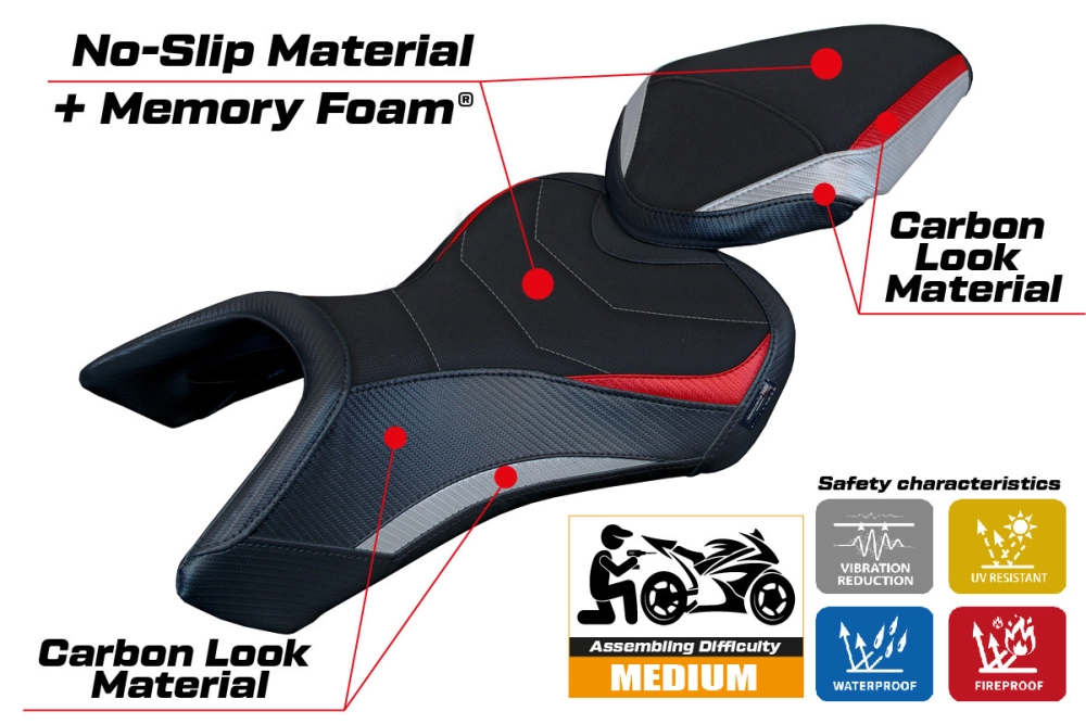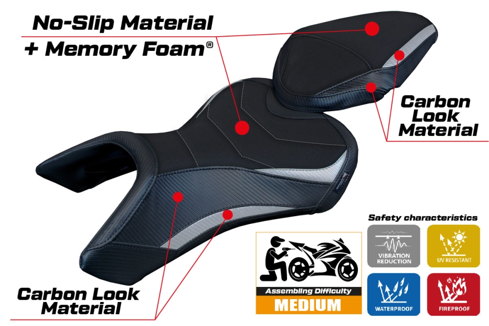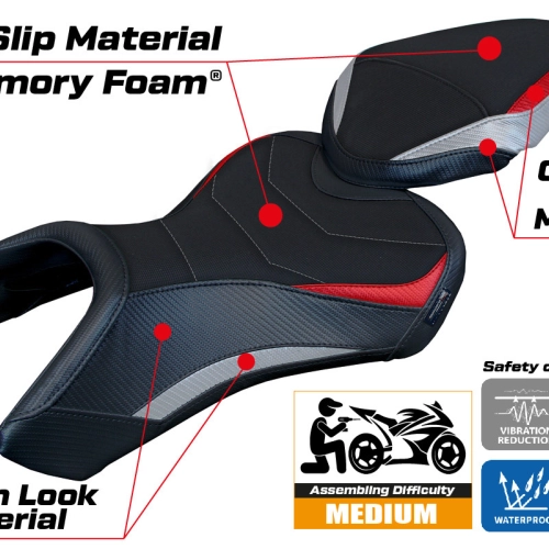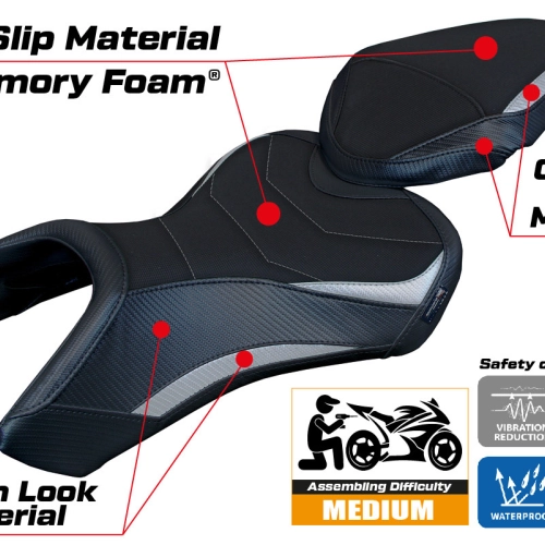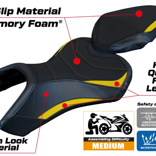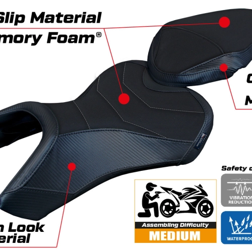 - Confortsystem : Ce revêtement est à l'extérieur exactement identique à tous les autres couvercles, mais est couplé à l'intérieur avec une couche spéciale de 2,5 cm de mousse à mémoire de forme. Tappezzeria Italia est le seul fabricant a utilisé la technologie de la Memory Foam qui permet d'améliorer le confortde conduite en réduisant la fatigue et les vibrations de la moto.