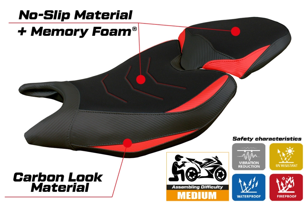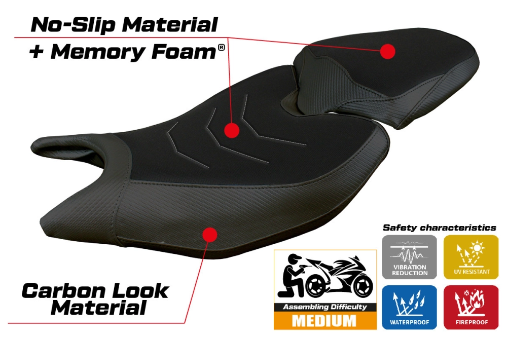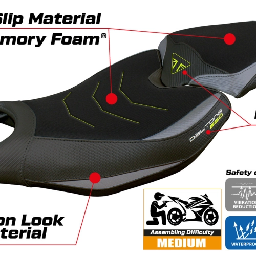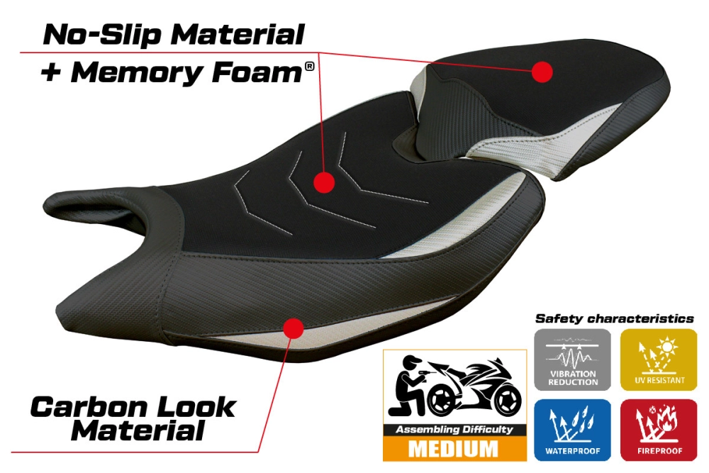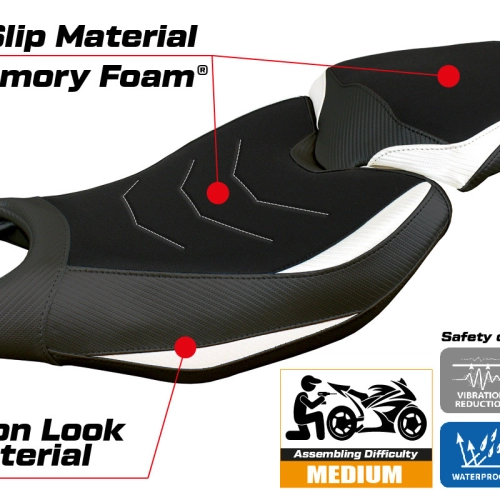 - Confortsystem : Ce revêtement est à l'extérieur exactement identique à tous les autres couvercles, mais est couplé à l'intérieur avec une couche spéciale de 2,5 cm de mousse à mémoire de forme. Tappezzeria Italia est le seul fabricant a utilisé la technologie de la Memory Foam qui permet d'améliorer le confortde conduite en réduisant la fatigue et les vibrations de la moto.