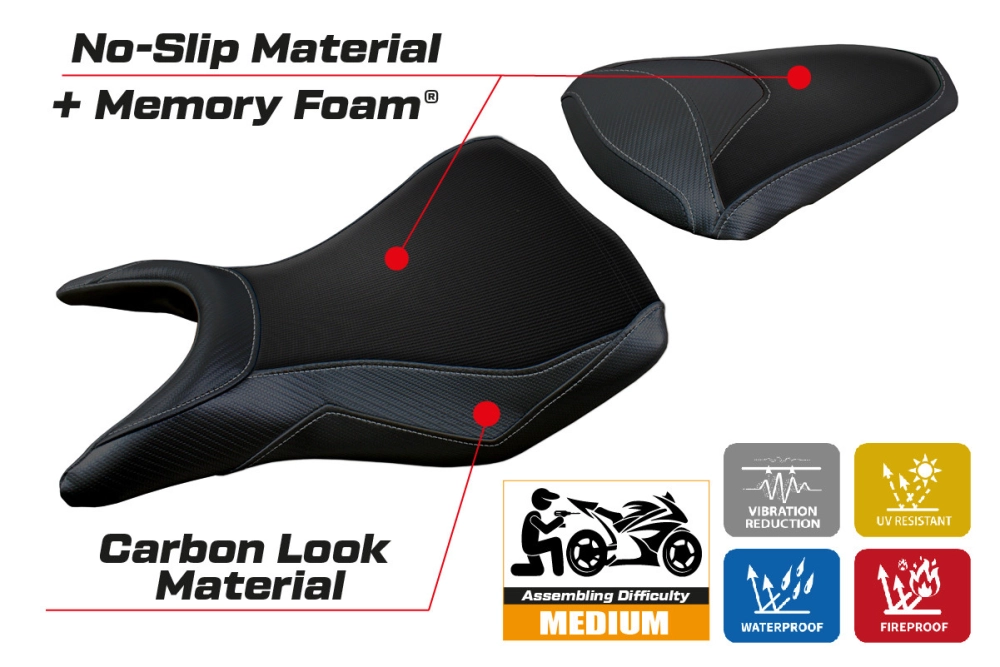 - Confortsystem : Ce revêtement est à l'extérieur exactement identique à tous les autres couvercles, mais est couplé à l'intérieur avec une couche spéciale de 2,5 cm de mousse à mémoire de forme. Tappezzeria Italia est le seul fabricant a utilisé la technologie de la Memory Foam qui permet d'améliorer le confortde conduite en réduisant la fatigue et les vibrations de la moto.