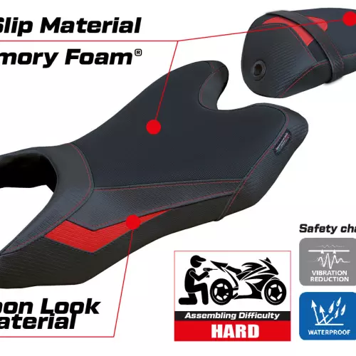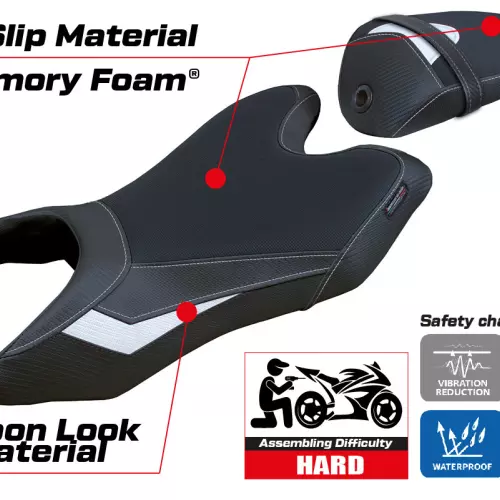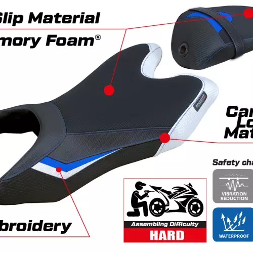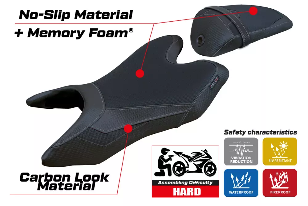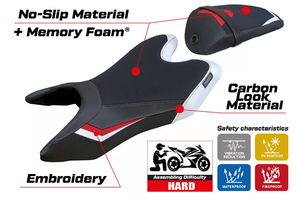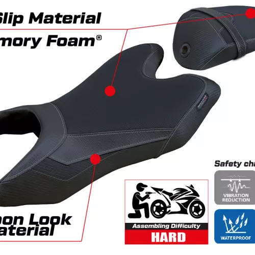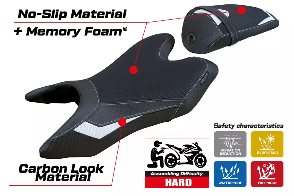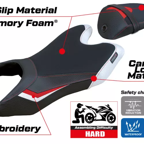 - Confortsystem : Ce revêtement est à l'extérieur exactement identique à tous les autres couvercles, mais est couplé à l'intérieur avec une couche spéciale de 2,5 cm de mousse à mémoire de forme. Tappezzeria Italia est le seul fabricant a utilisé la technologie de la Memory Foam qui permet d'améliorer le confortde conduite en réduisant la fatigue et les vibrations de la moto.