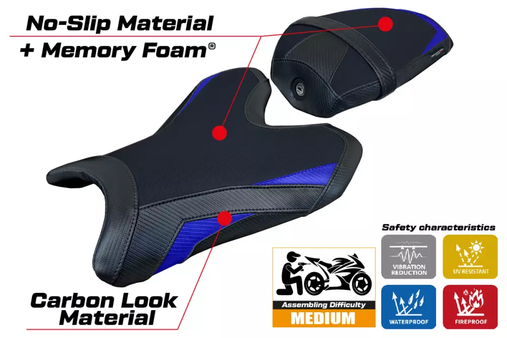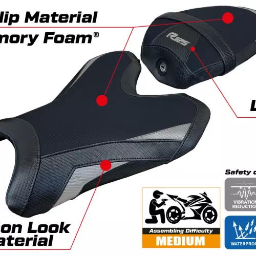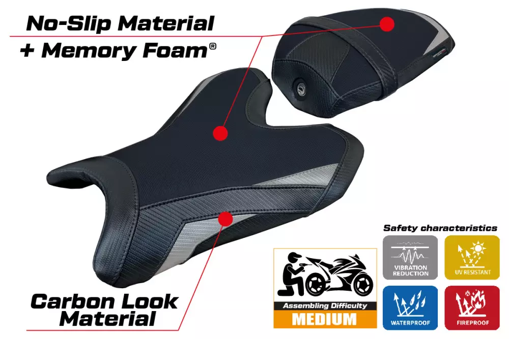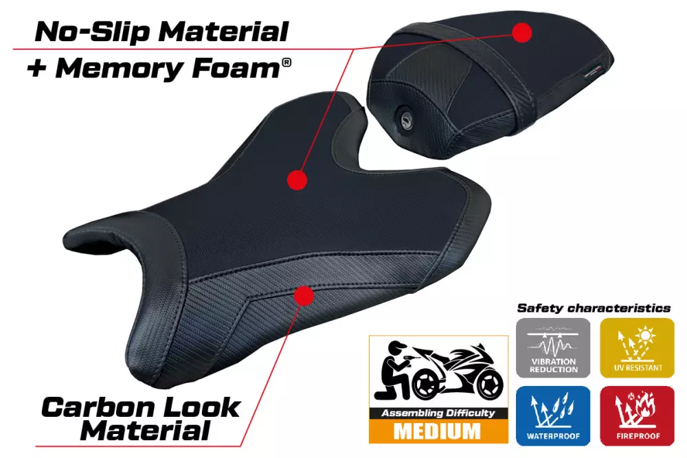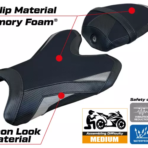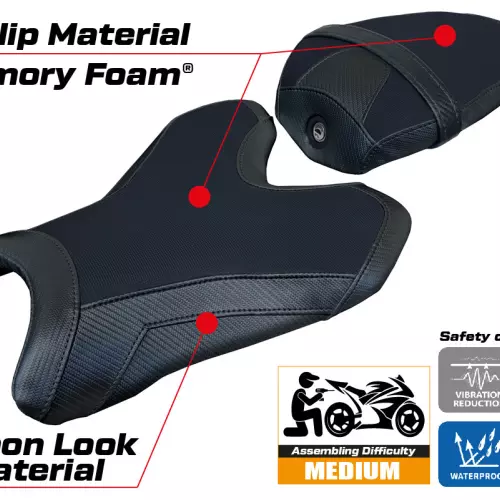 - Confortsystem : Ce revêtement est à l'extérieur exactement identique à tous les autres couvercles, mais est couplé à l'intérieur avec une couche spéciale de 2,5 cm de mousse à mémoire de forme. Tappezzeria Italia est le seul fabricant a utilisé la technologie de la Memory Foam qui permet d'améliorer le confortde conduite en réduisant la fatigue et les vibrations de la moto.