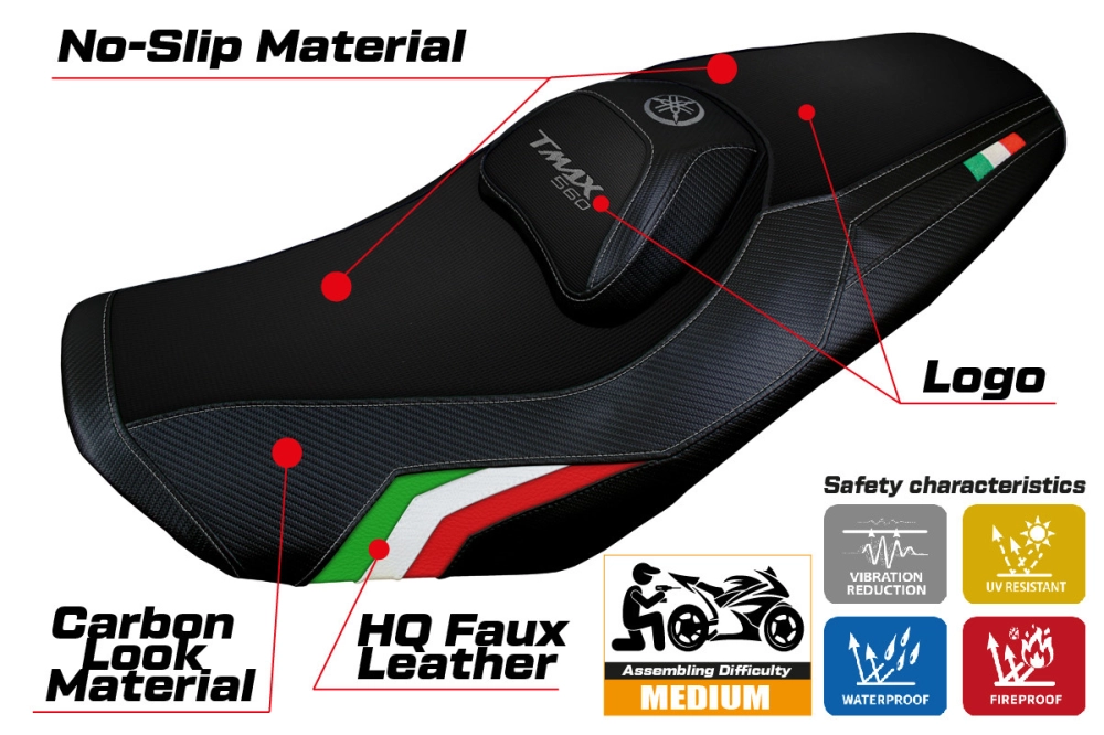 Le Couvre selle Tappezzeria Yamaha T-Max 560 (22-24) modèle Kira vous permet de changer facilement l'esthétique de votre siège de moto d'origine. Il possèdes des caractéristiques techniques essentielles pour une housse de siège moto de qualité : imperméable et résistant au soleil, coutures renforcées à double piqûre et une haute résistance aux produits chimiques.