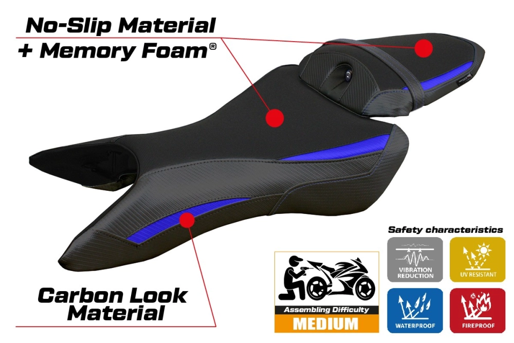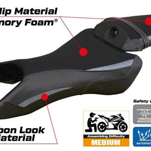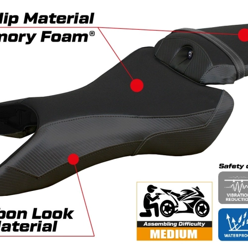 - Confortsystem : Ce revêtement est à l'extérieur exactement identique à tous les autres couvercles, mais est couplé à l'intérieur avec une couche spéciale de 2,5 cm de mousse à mémoire de forme. Tappezzeria Italia est le seul fabricant a utilisé la technologie de la Memory Foam qui permet d'améliorer le confortde conduite en réduisant la fatigue et les vibrations de la moto.