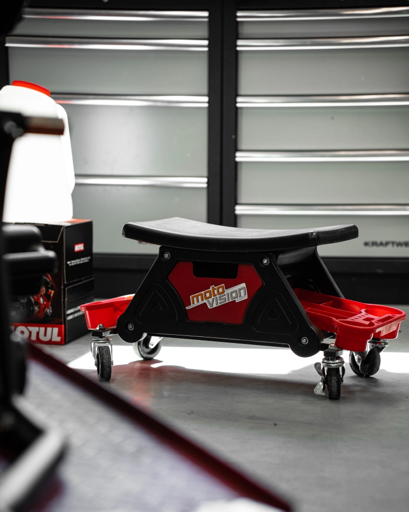Envie de bricoler sur votre moto avec plus de confort ? Optez pour notre tabouret d'atelier mobile équipé d’un bac de rangement pratique pour avoir toujours vos outils, vis et petits accessoires à portée de main.
