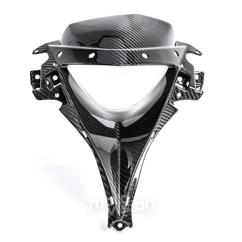 Cache centre de tête de fourche carbone Kawasaki ZX6 2009-2012 à monter directement sur les points de fixation d'origine de votre moto en remplacement du carénage d'origine. Les pièces en carbone sont livrées sans visserie.