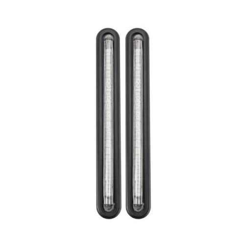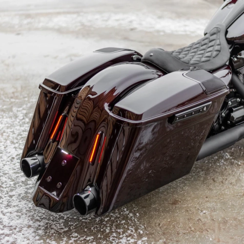 Ce support personnalisé avec éclairage LED peut être installé sur des sacoches d’origine ou rallongées, en se fixant directement dans les panneaux de remplissage.Le système LED peut être configuré pour fonctionner en feux de position, feux stop et clignotants (système 3-en-1 : position-stop-clignotant) dans un seul élément. Bicolore ambre et rouge, avec 40 LED, un angle de visibilité de 120°, un espacement de 1 mm entre les LED et une conception entièrement étanche. Plage de fonctionnement : 9 à 14 volts. Les supports de feux arrière pour bagger sont usinés à partir d’un bloc d’aluminium massif (billet) et disponibles en finition brute (CNC) ou anodisée noire. Longueur totale : 15,7 cm. Homologués E-Marked.