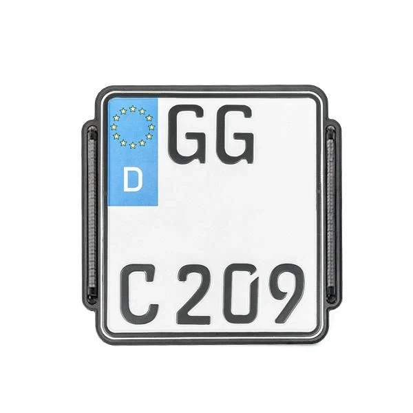 Support de plaque d'immatriculation en aluminium CNC (180x200 mm) avec éclairage LED pour clignotants et feux stop.Ce système permet de transformer les LED en feux de position, feux stop et clignotants (système 3-en-1 : position-stop-clignotant) dans un seul élément. Équipé de 40 LED bicolores ambre et rouge, avec un angle de visibilité de 120°, un espacement des LED de 1 mm et une conception étanche. Fonctionne sous une tension de 9 à 14 volts. Homologué ECE.