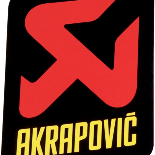 Autocollants de la marque AKRAPOVIC de rechange, résistant à la chaleur. Coloris Noir, Rouge, Jaune. Largeur : 90 mm, hauteur : 95 mm.