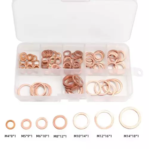 Lot rondelles cuivre moteur M4 M14 idéal pour garantir l’étanchéité des bouchons de vidange, raccords d’huile, carburant ou hydraulique. Contient 100 rondelles plates écrasables en cuivre massif, de 9 tailles différentes, livrées dans une boîte de rangement compartimentée.