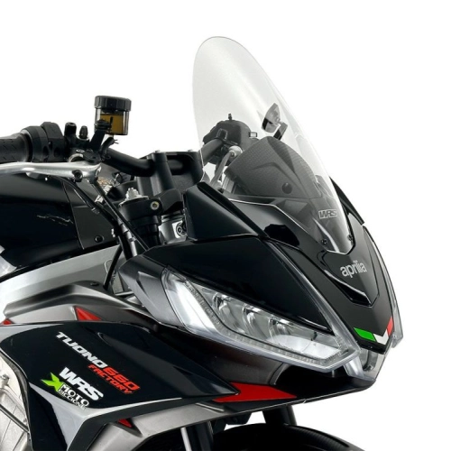 Bulle WRS Touring Aprilia TUONO 660 Transparente réalisée en plexiglas PMMA de haute qualité. Les turbulences gênantes sur les épaules et le casque sont éliminées. Protection accrue offerte par la bulle. S'intègre parfaitement à la ligne de la moto pour un look encore plus attrayant.