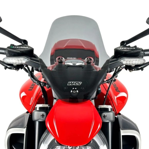 Bulle WRS Touring Ducati DIAVEL V4 Fumée Noir réalisée en plexiglas PMMA de haute qualité. Les turbulences gênantes sur les épaules et le casque sont éliminées. Protection accrue offerte par la bulle. S'intègre parfaitement à la ligne de la moto pour un look encore plus attrayant.