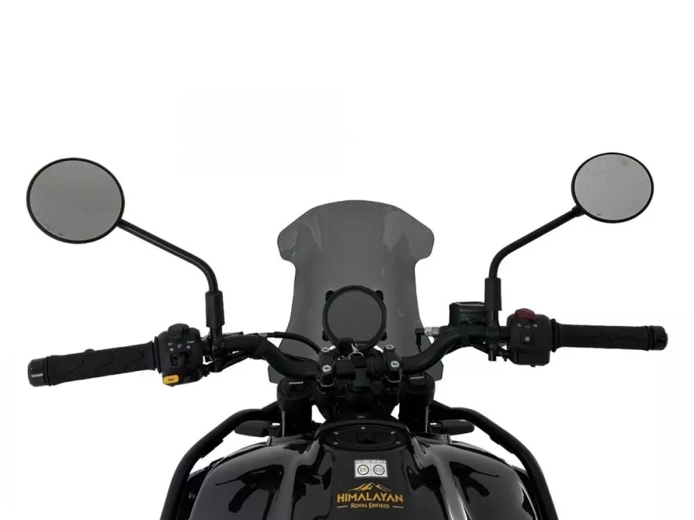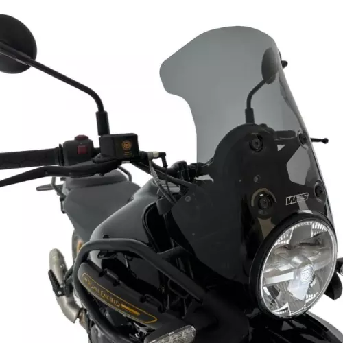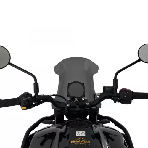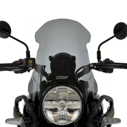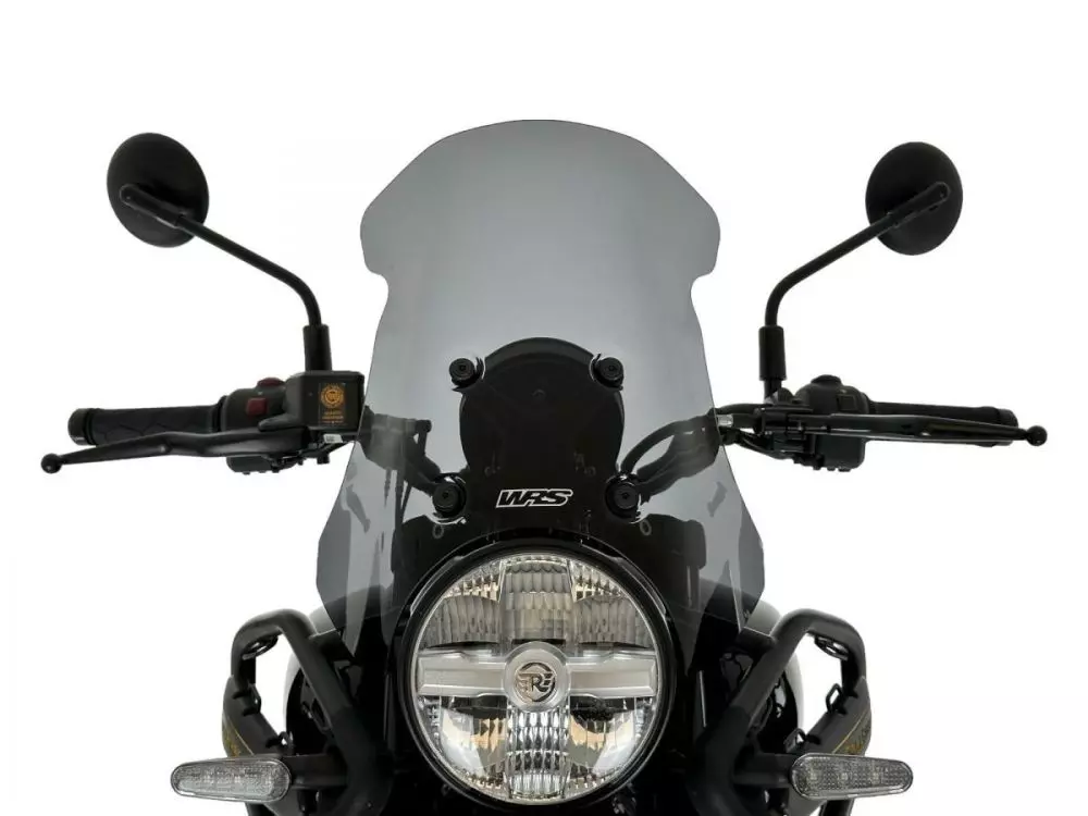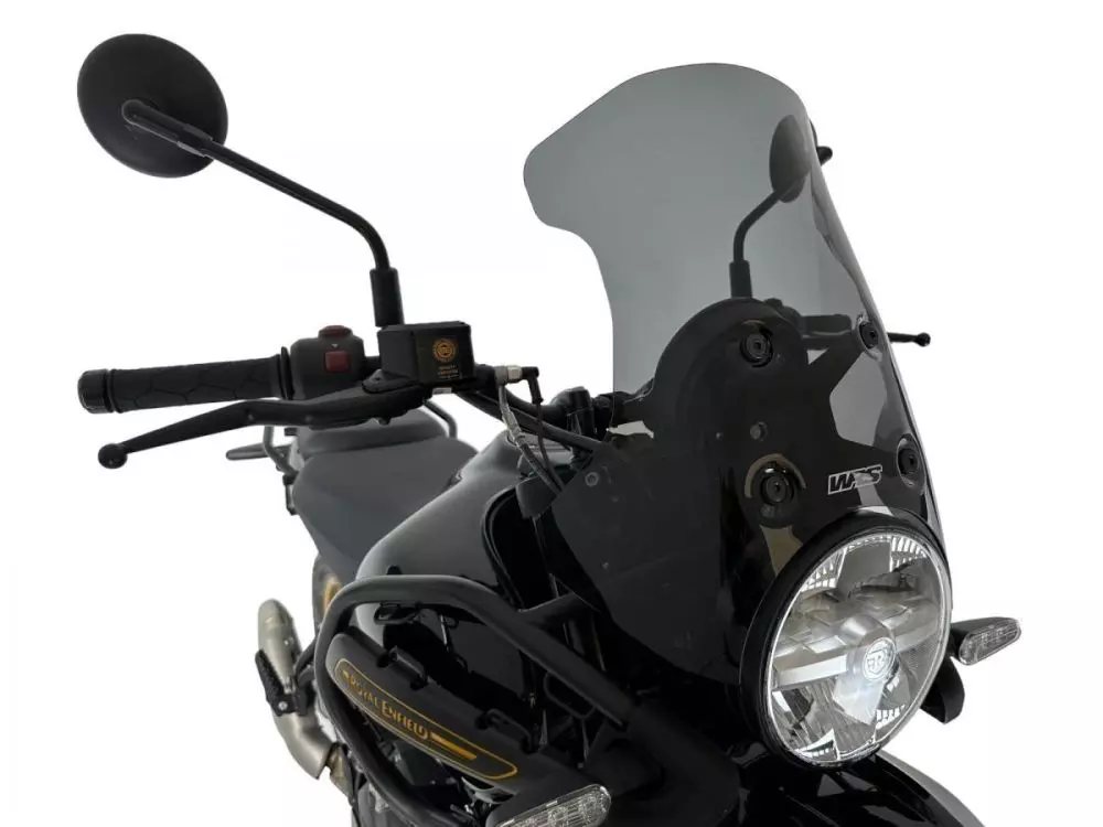 Bulle WRS Touring Royal Enfield HIMALAYAN 450 Fumée Noir réalisée en plexiglas PMMA de haute qualité. Les turbulences gênantes sur les épaules et le casque sont éliminées. Protection accrue offerte par la bulle. S'intègre parfaitement à la ligne de la moto pour un look encore plus attrayant.