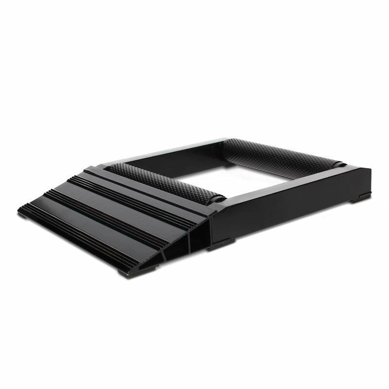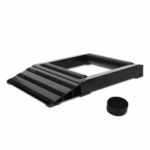 Le support d'entretien moto est livré avec sa cale en caoutchouc de rehausse noire pour poser la moto sur béquille latérale sans risque de chute.