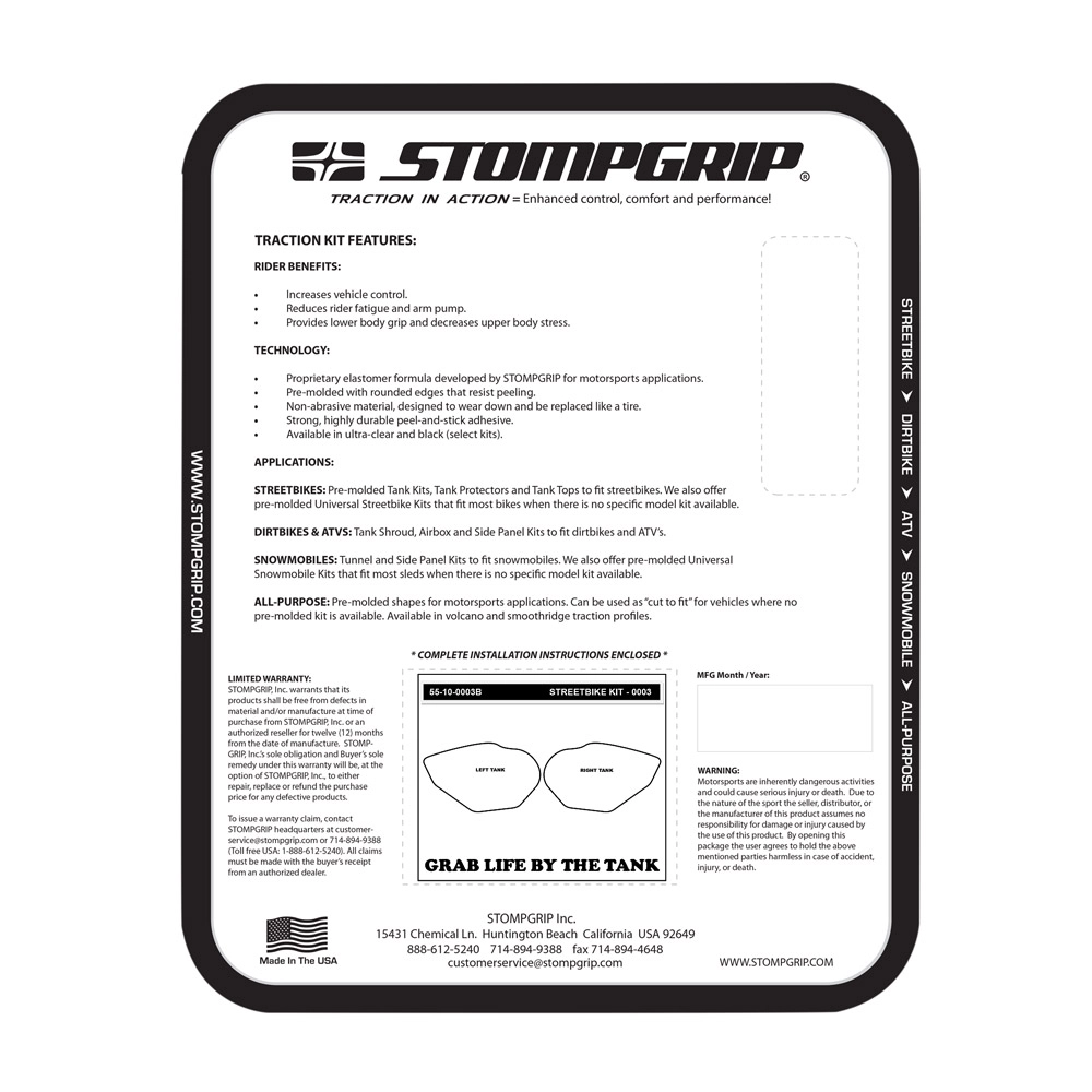 Améliorez le contrôle de votre moto en y apposant des protections de réservoir antidérapantes adhésives de la marque Stompgrip.