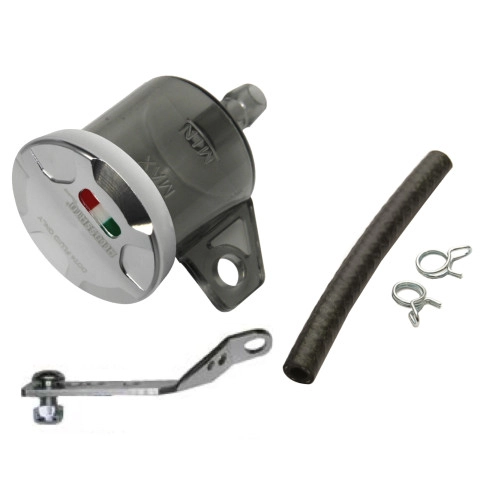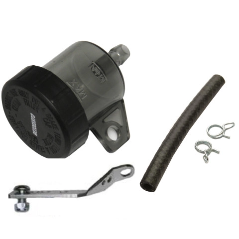 Kit de montage Accossato pour réservoir de liquide de frein comprenant un petit réservoir (modèle noir) d'une capacité de 15 ml, une durite en caoutchouc, un collier de serrage et un support en aluminium.