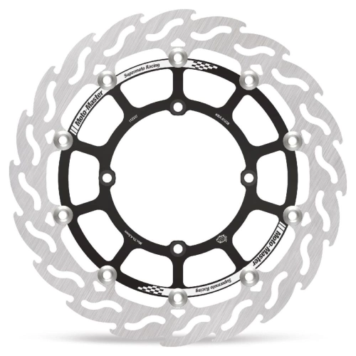 - Les disques avant flottants de 320 mm au motif de flamme sont spécialement conçus pour être utilisés avec des étriers à 4 pistons Moto-Master et non des pièces d'origine