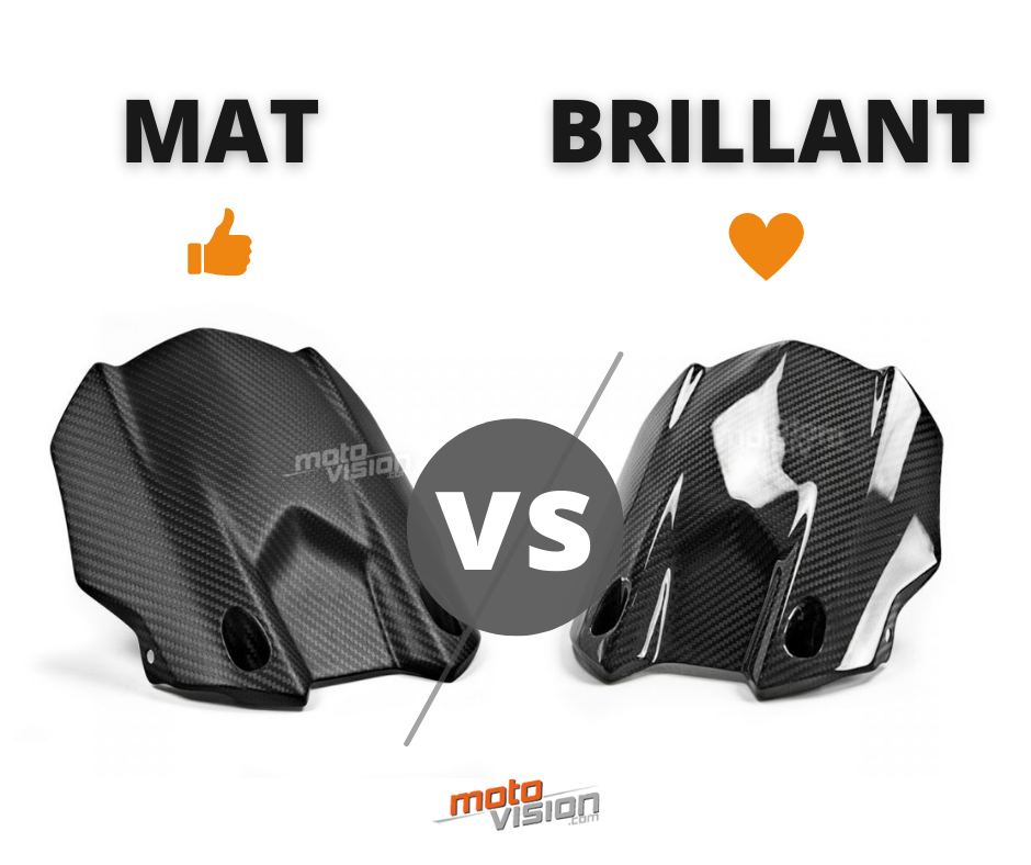 Le carbone brillant a une allure plus sportive et reflète la lumière, créant un effet miroir et faisant briller la moto. Il a aussi l'atout de moins laisser paraître les traces de graisse ou encore les rayures.