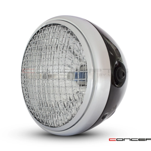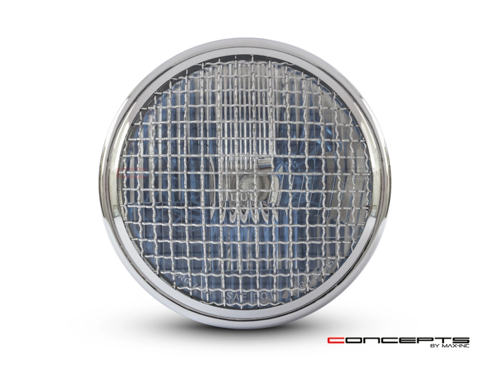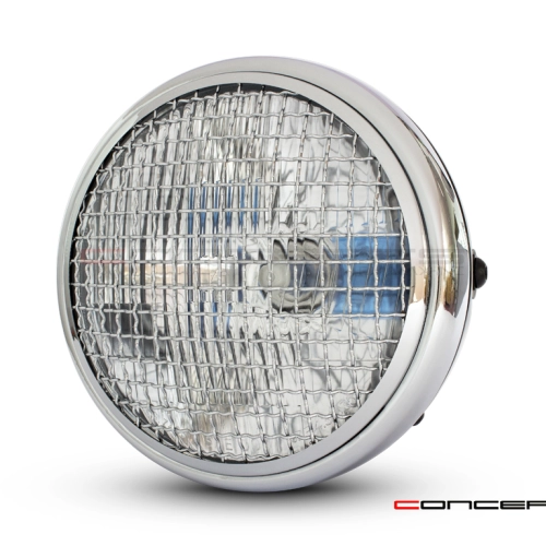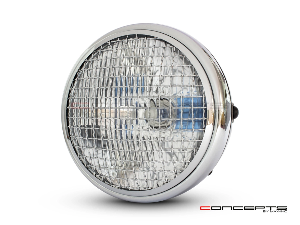 High quality classic style headlight with chrome mesh grill. Internally this headlight has a semi-sealed glass insert with a H4 halogen bulb.