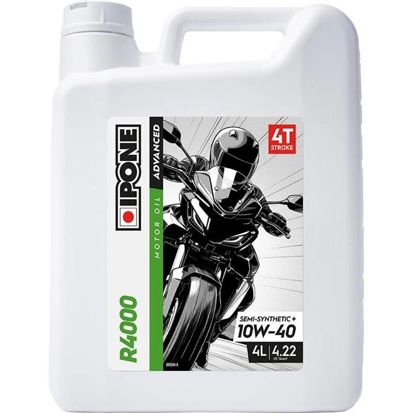 Lubrificante motore Ipone R4000 10W-40 4L, semisintetico + (Tecnologia Ester). Olio di alta qualità a base di esteri per moto 4 tempi, destinato a un uso regolare. IPONE ha selezionato le migliori basi sintetiche e gli additivi per garantire la massima protezione del motore e un’eccezionale resistenza al taglio.