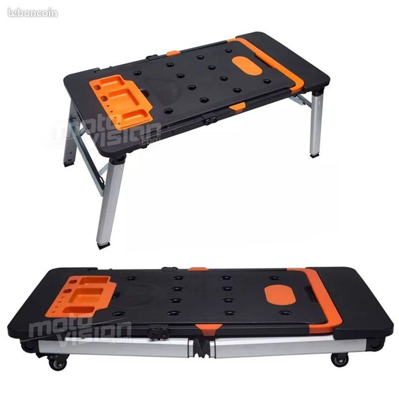 très bon produit il ma l'air résistant ( je suis monté dessus et il na pas bouger ) je fait 103 kg) table très bien réfléchi. hauteur suffisante pour travailler couper etc.. dommage que les roulettes soit petite mais je comprend qu'il faut plier et déplier les pieds. il et moins cher que sur un autre site car il n'y a pas sur le coté les prises de branchements 220 volts