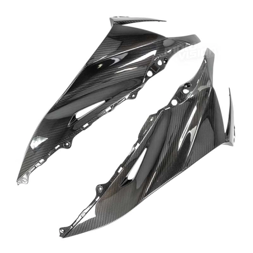 Flancs supérieurs carbonio luminoso Kawasaki ZX10R 2011 - 2015 da montare direttamente sui punti di fissaggio originali della moto per sostituire la carenatura originale. Le parti in carbonio vengono fornite senza viti e bulloni.