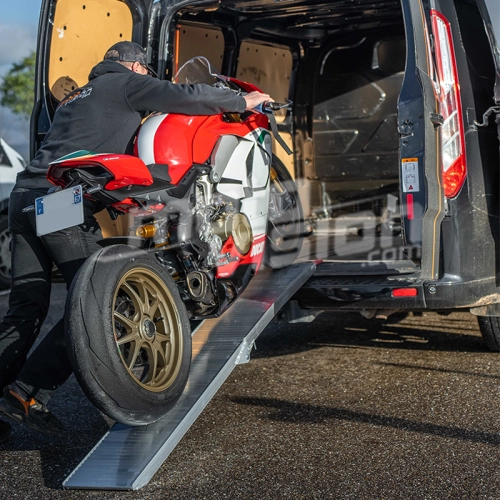 Rampe solide et large pour charger une moto de 200kg dans ma fourgonnette , elle assure parfaitement sa fonction .