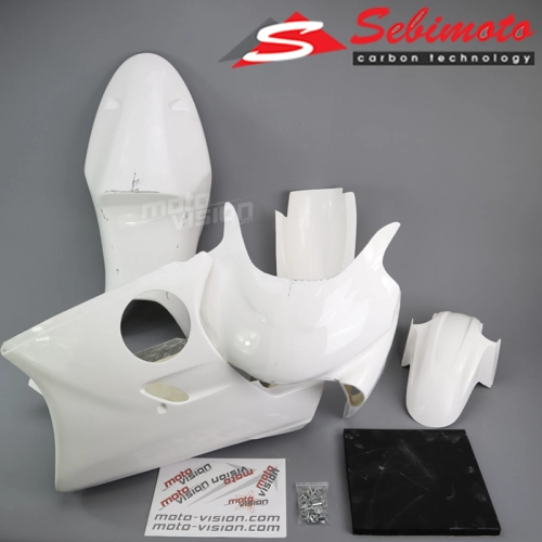 Kit completo carena Sebimoto Honda CBR 600 F PC35 1999-2000 in fibra di vetro intrecciata con rinforzi in kevlar. Il prodotto si monta facilmente sulla moto grazie alla marcatura dei punti di foratura e alla buona finitura della carenatura.