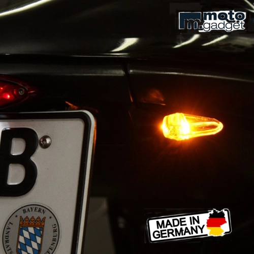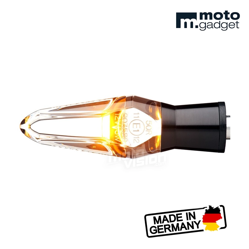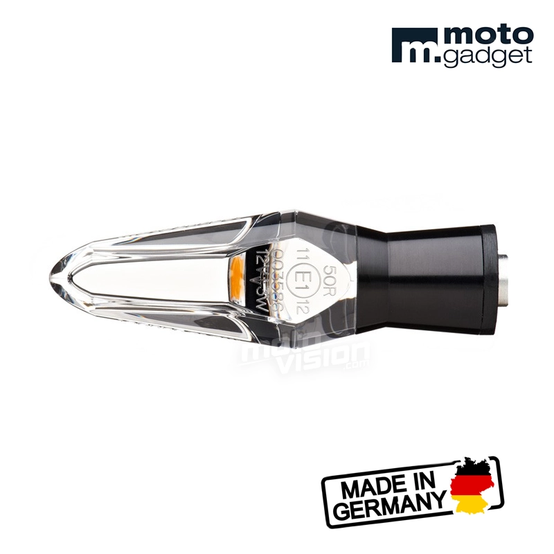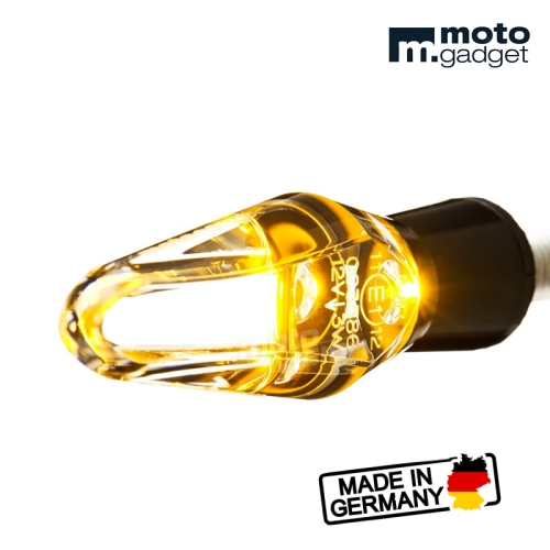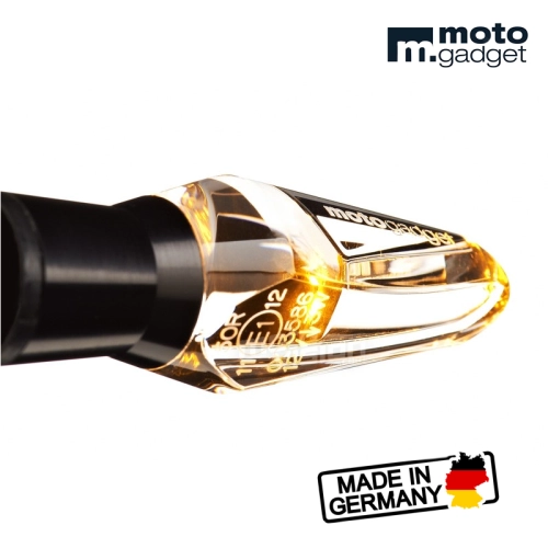 Grazie alla TranzLight-Technology® (TLT, in attesa di brevetto) di Motogadget, il corpo trasparente del lampeggiatore diventa esso stesso un mezzo di illuminazione. La TranzLight-Technology® sfrutta in modo intelligente la riflessione totale delle onde luminose. Questo approccio di sviluppo progressivo va oltre la semplice miniaturizzazione degli alloggiamenti dei lampeggiatori, modellando la luce direttamente su un corpo di vetro cristallino. Solo precisi calcoli ottici CAD e processi produttivi all'avanguardia rendono possibile questo nuovo design e la sua funzione.