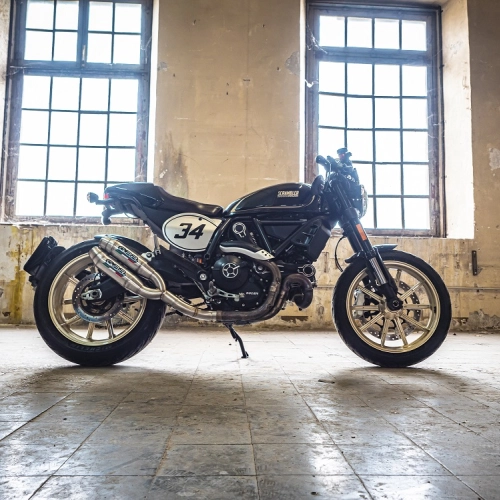 Specializzato in titanio e acciaio, il marchio italiano GPR Exhaust System può equipaggiare la tua Ducati Scrambler 800 2017 - 2020 con il Deeptone Inox, uno scarico slip-on doppio omologato che include DB Killer rimovibili, tubi di collegamento e catalizzatori.