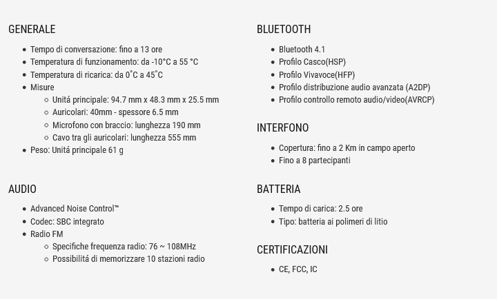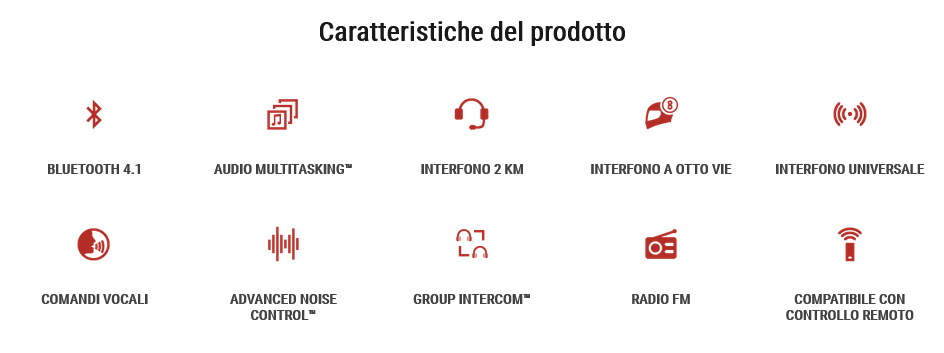 - Bluetooth 4.1 - Radio FM - Audio Multitasking™ - Controllo avanzato del rumore™ - 2 km di portata - Mesh Intercom™ - Interfono a otto vie