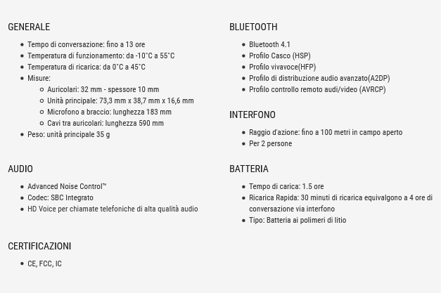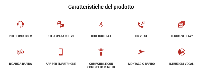 - Bluetooth 4.1 - Attacco rapido - Interfono 100 m - Conversazione pilota-passeggero - Sovrapposizione audio - Applicazione per smartphone - Carica rapida