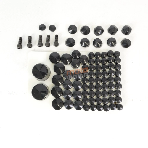 Kit Toppers in ABS nero per Harley Davidson Softail Twin Cam 1984-2006 comprendente 71 pezzi e un sacchetto di coperture con le viti incluse. Questi elementi permettono di guadagnare in estetica nascondendo i bulloni sotto tappi neri.
