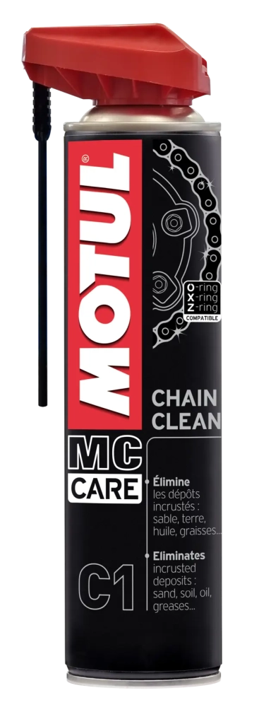 Motul C1 All Chain Cleaner 400ml pulisce perfettamente tutti i tipi di catene di moto (stradali e fuoristrada) e di altri veicoli (bici, motorini, kart, quad...). È compatibile con le guarnizioni per catena O-ring, X-ring e Z-ring.