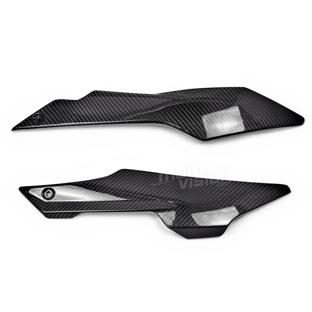 Laterali dello spoiler anteriore carbonio Triumph Speed Triple 1200 2021-2022 que se monta directamente en los puntos de fijación originales de su moto para sustituir el carenado original. Las piezas de carbono se entregan sin tornillos ni pernos.